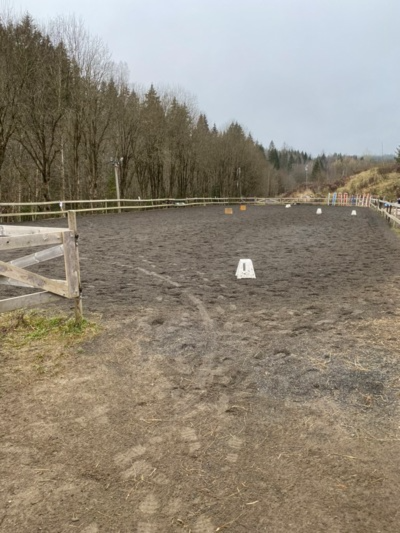 Vår utendørs ridebane (20x60) ligger rett ved siden av stallen. Ridebanen ble utvidet og fikk ny sandbunn sommeren 2021. Høsten 2024 har banen fått ny sand, takket være støtte fra Sparebankstiftelsen DNB.
