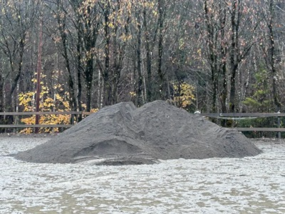 Første levering av ny, litt mer grovkornet sand. Som vi håper skal drenere bedre.